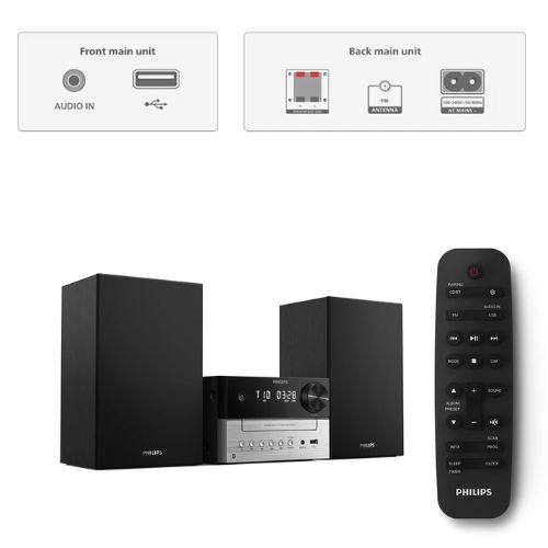 With its subtly two-toned central unit and speaker cabinets, this handsome micro system recalls the design of classic hi-fi separates. The compact build makes the system easy to position in your home, and there are buttons on the front of the unit for playback and source selection.