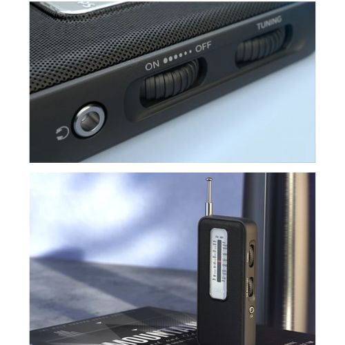 One-handed operation is easy with this little radio. Volume and on/off are both controlled by a conveniently placed thumbwheel. There’s a headphone port for private listening and a side-mounted switch to select FM or MW signals.