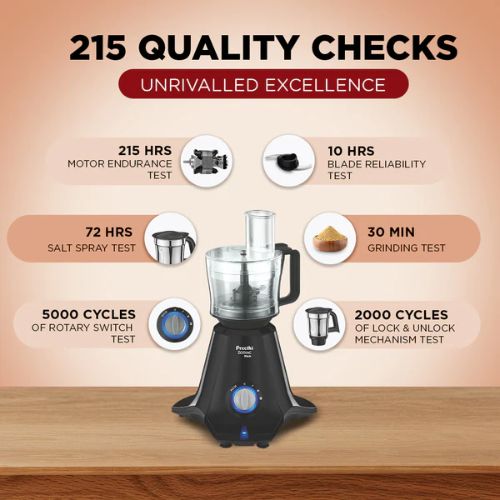Atta Kneading Blade: Kneads 300 Gm atta into soft dough in 1 min. Experiment 10 different types of rotis. Chopping Blade: Chop vegetables in 4 pulses and make puree in seconds. Slicing Blade: Slices even tough vegetables like Elephant yam, Bitter gourd etc in seconds. Grating blades: Grates vegetables within a few seconds.